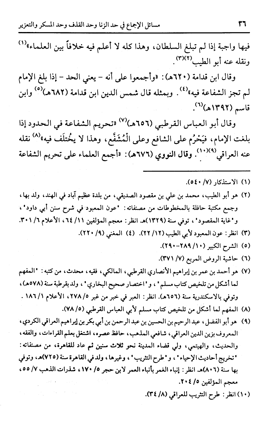 وقال ابن قدامة (620 هـ): "وأجمعوا على أنه -يعني الحد- إذا بلغ الإمام لم تجز الشفاعة فيه" (¬4). وبمثله قال شمس الدين ابن قدامة (682 هـ) (¬5) وابن قاسم (1392 هـ) (¬6).
