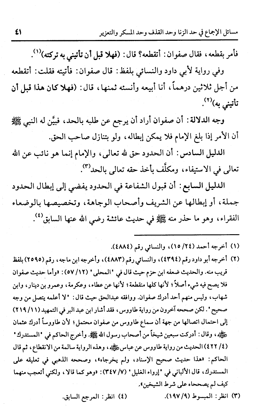 الدليل السابع: أن قبول الشفاعة في الحدود يفضي إلى إبطال الحدود جملة، أو إبطالها عن الشريف وأصحاب الوجاهة، وتخصيصها بالوضعاء الفقراء، وهو ما حذر منه -صلى اللَّه عليه وسلم- في حديث عائشة رضي اللَّه عنها السابق (¬4).