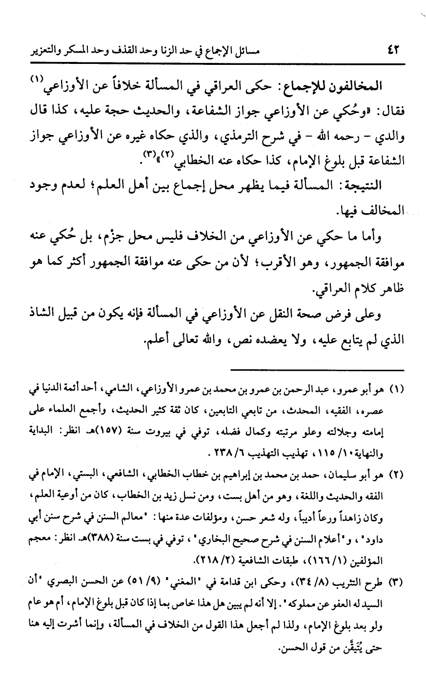 • المخالفون للإجماع: حكى العراقي في المسألة خلافًا عن الأوزاعي (¬1) فقال: "وحُكي عن الأوزاعي جواز الشفاعة، والحديث حجة عليه، كذا قال والدي -رحمه اللَّه- في شرح الترمذي، والذي حكاه غيره عن الأوزاعي جواز الشفاعة قبل بلوغ الإمام، كذا حكاه عنه الخطابي (¬2) " (¬3).Rالمسألة فيما يظهر محل إجماع بين أهل العلم؛ لعدم وجود المخالف فيها.
