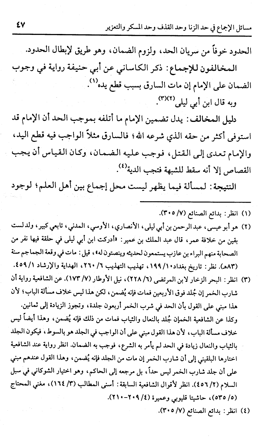 • المخالفون للإجماع: ذكر الكاساني عن أبي حنيفة رواية في وجوب الضمان على الإمام إن مات السارق بسبب قطع يده (¬1).