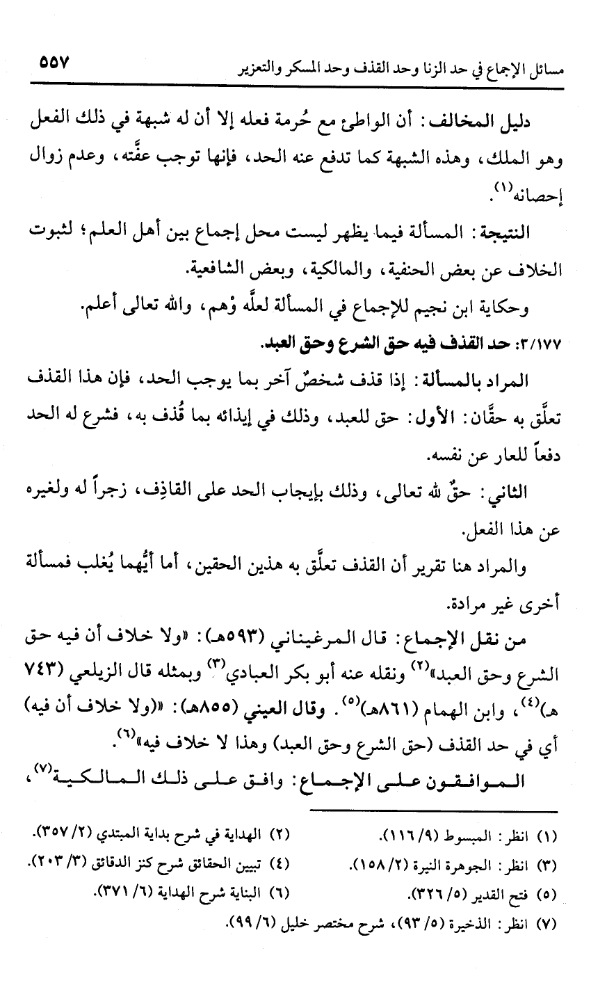 • من نقل الإجماع: قال المرغيناني (593 هـ): "ولا خلاف أن فيه حق الشرع وحق العبد" (¬2) ونقله عنه أبو بكر العبادي (¬3) وبمثله قال الزيلعي (743 هـ) (¬4)، وابن الهمام (861 هـ) (¬5). وقال العيني (855 هـ): " (ولا خلاف أن فيه) أي في حد القذف (حق الشرع وحق العبد) وهذا لا خلاف فيه" (¬6).