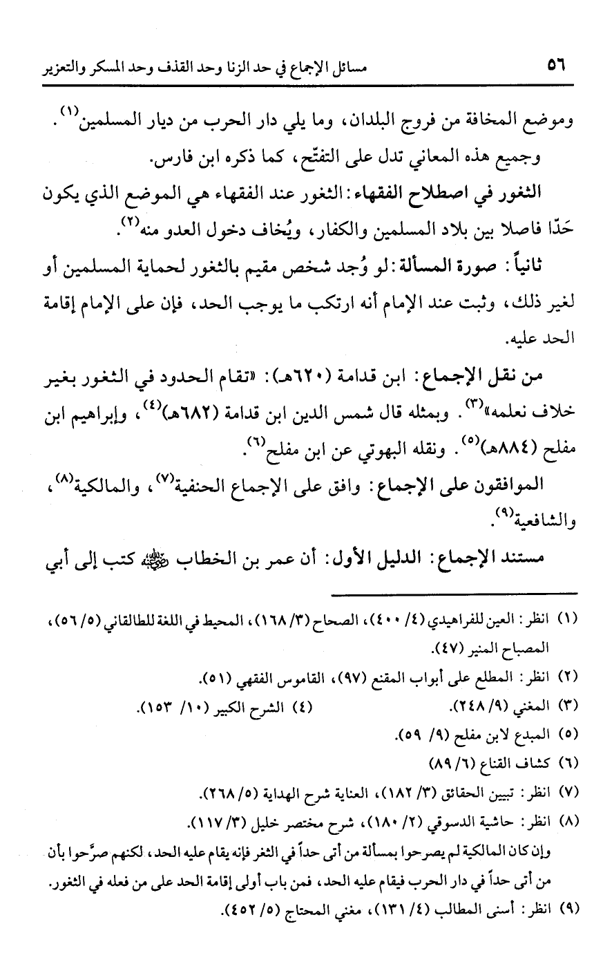 • من نقل الإجماع: ابن قدامة (620 هـ): "تقام الحدود في الثغور بغير خلاف نعلمه" (¬3). وبمثله قال شمس الدين ابن قدامة (682 هـ) (¬4)، وإبراهيم ابن مفلح (884 هـ) (¬5). ونقله البهوتي عن ابن مفلح (¬6).