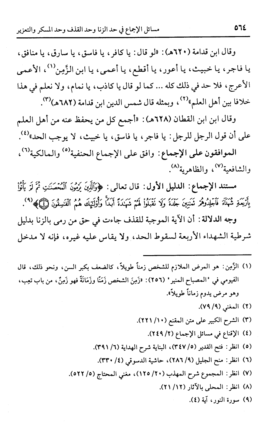• مستند الإجماع: الدليل الأول: قال تعالى: {وَالَّذِينَ يَرْمُونَ الْمُحْصَنَاتِ ثُمَّ لَمْ يَأْتُوا بِأَرْبَعَةِ شُهَدَاءَ فَاجْلِدُوهُمْ ثَمَانِينَ جَلْدَةً وَلَا تَقْبَلُوا لَهُمْ شَهَادَةً أَبَدًا وَأُولَئِكَ هُمُ الْفَاسِقُونَ (4)} (¬9).