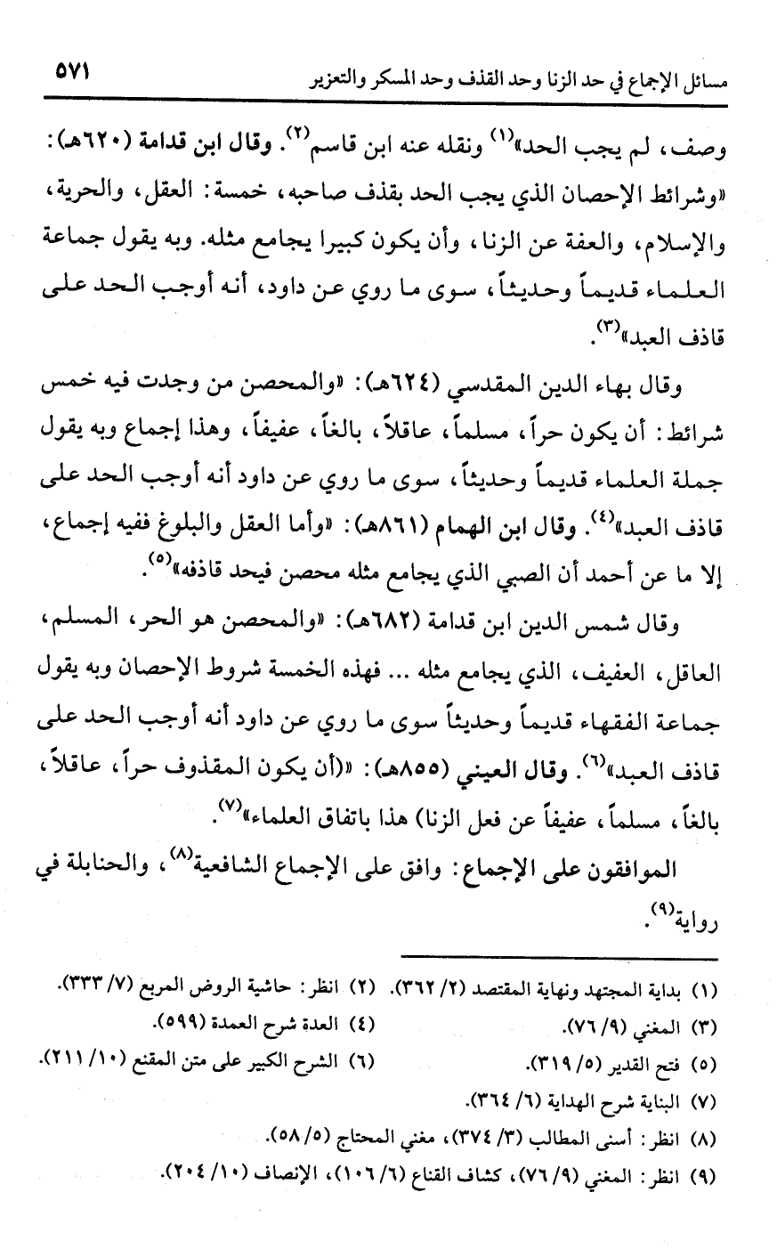 وقال بهاء الدين المقدسي (624 هـ): "والمحصن من وجدت فيه خمس شرائط: أن يكون حرًا، مسلمًا، عاقلًا، بالغًا، عفيفًا، وهذا إجماع وبه يقول جملة العلماء قديمًا وحديثًا، سوى ما روي عن داود أنه أوجب الحد على قاذف العبد" (¬4). وقال ابن الهمام (861 هـ): "وأما العقل والبلوغ ففيه إجماع، إلا ما عن أحمد أن الصبي الذي يجامع مثله محصن فيحد قاذفه" (¬5).