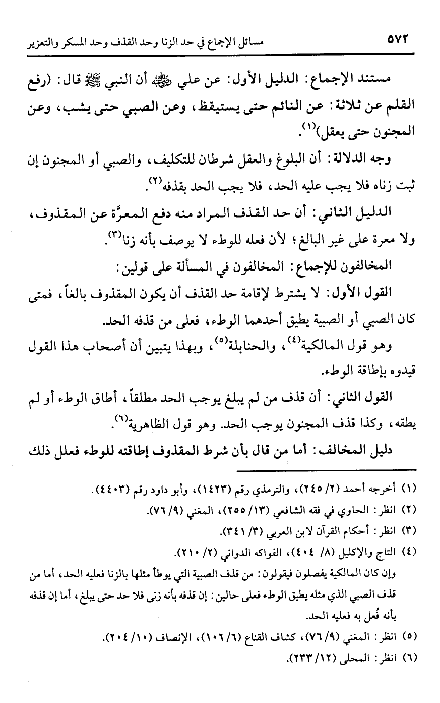 • مستند الإجماع: الدليل الأول: عن علي -رضي اللَّه عنه- أن النبي -صلى اللَّه عليه وسلم- قال: (رفع القلم عن ثلاثة: عن النائم حتى يستيقظ، وعن الصبي حتى يشب، وعن المجنون حتى يعقل) (¬1).