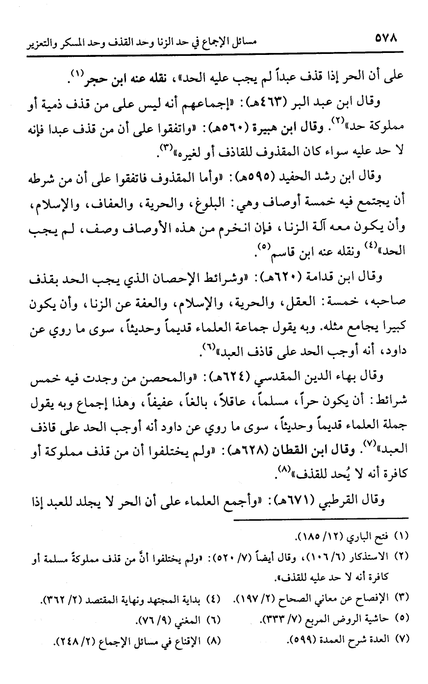 وقال بهاء الدين المقدسي (624 هـ): "والمحصن من وجدت فيه خمس شرائط: أن يكون حرًا، مسلمًا، عاقلًا، بالغًا، عفيفًا، وهذا إجماع وبه يقول جملة العلماء قديمًا وحديثًا، سوى ما روي عن داود أنه أوجب الحد على قاذف العبد" (¬7). وقال ابن القطان (628 هـ): "ولم يختلفوا أن من قذف مملوكة أو كافرة أنه لا يُحد للقذف" (¬8).