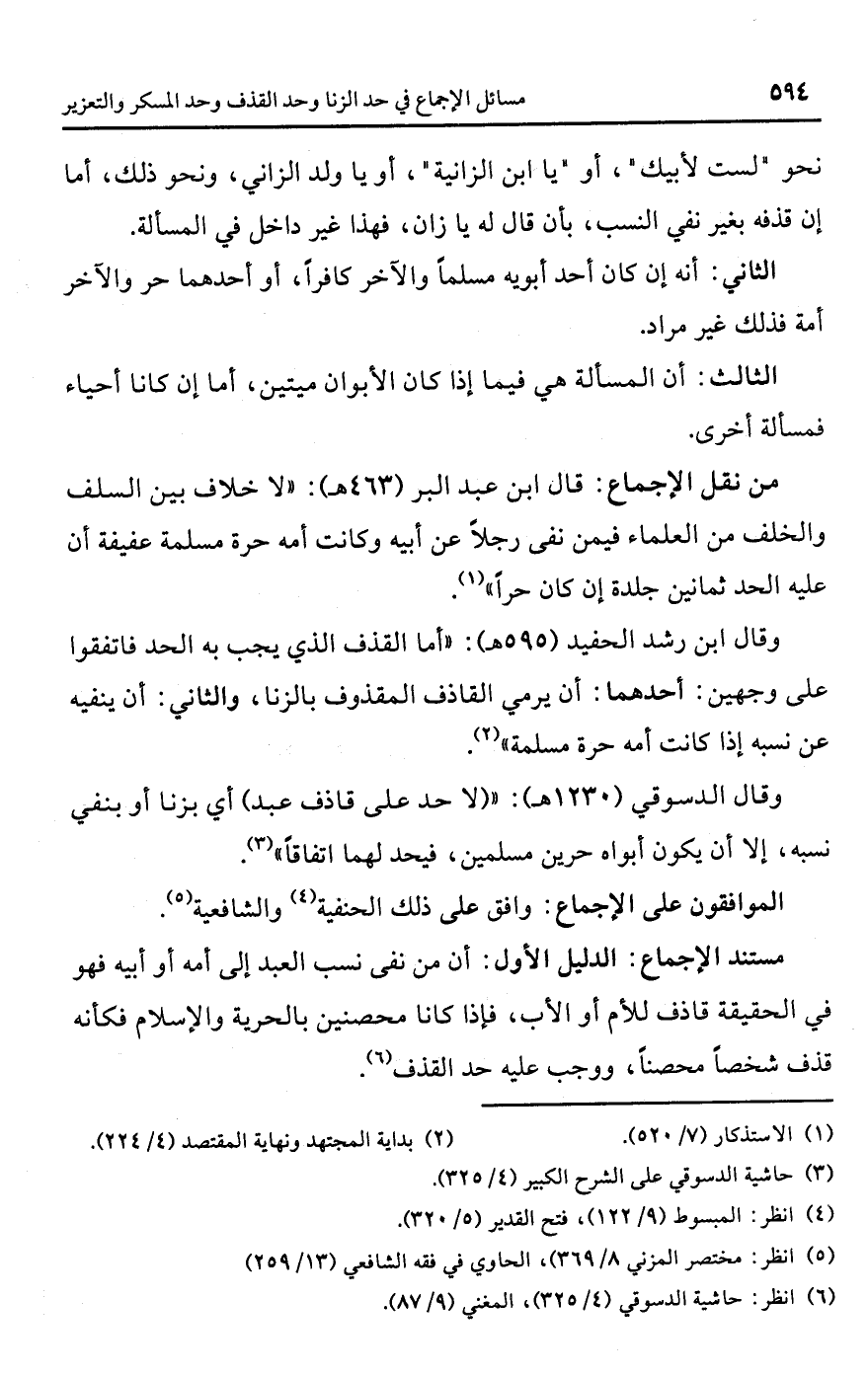• من نقل الإجماع: قال ابن عبد البر (463 هـ): "لا خلاف بين السلف والخلف من العلماء فيمن نفى رجلًا عن أبيه وكانت أمه حرة مسلمة عفيفة أن عليه الحد ثمانين جلدة إن كان حرًا" (¬1).