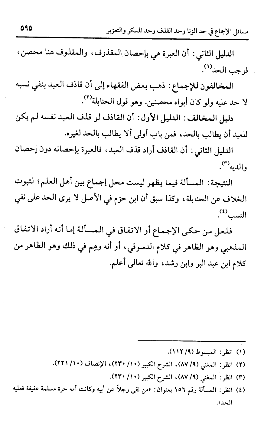 الدليل الثاني: أن القاذف أراد قذف العبد، فالعبرة بإحصانه دون إحصان والديه (¬3).Rالمسألة فيما يظهر ليست محل إجماع بين أهل العلم؛ لثبوت الخلاف عن الحنابلة، وكذا سبق أن ابن حزم في الأصل لا يرى الحد على نفي النسب (¬4).
