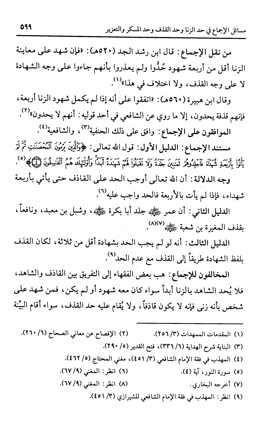 • من نقل الإجماع: قال ابن رشد الجد (520 هـ): "فإن شهد على معاينة الزنا أقل من أربعة شهود حُدُّوا ولم يعذروا بأنهم جاءوا على وجه الشهادة لا على وجه القذف، ولا اختلاف في هذا" (¬1).