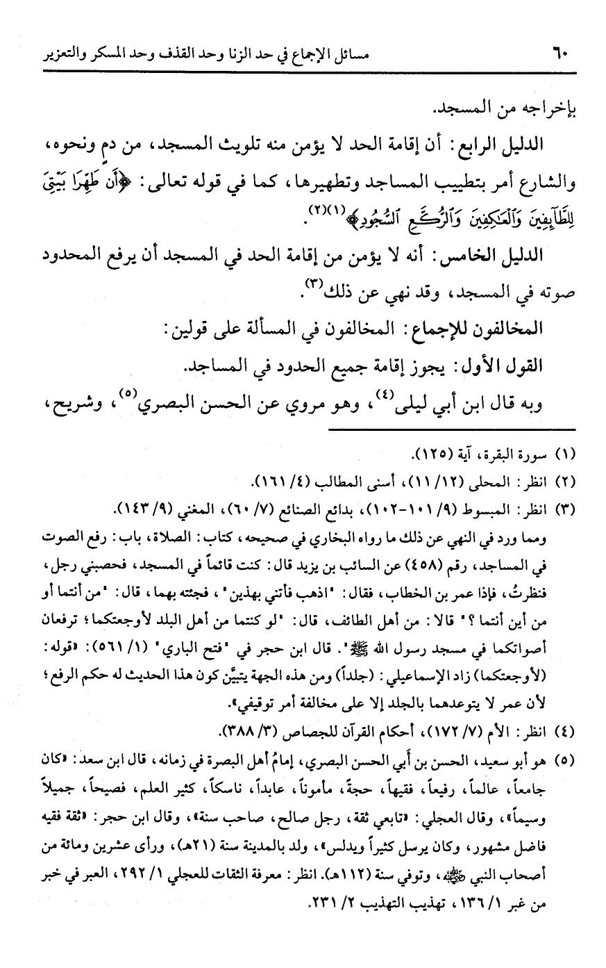 الدليل الرابع: أن إقامة الحد لا يؤمن منه تلويث المسجد، من دمٍ ونحوه، والشارع أمر بتطييب المساجد وتطهيرها، كما في قوله تعالى: {أَنْ طَهِّرَا بَيْتِيَ لِلطَّائِفِينَ وَالْعَاكِفِينَ وَالرُّكَّعِ السُّجُودِ} (¬1) (¬2).