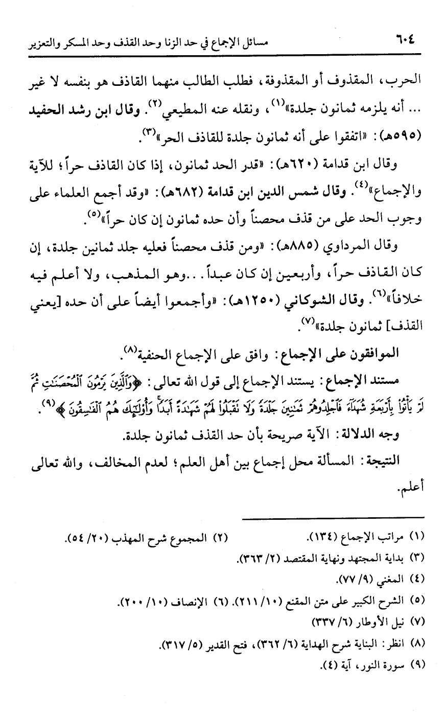 وقال المرداوي (885 هـ): "ومن قذف محصنًا فعليه جلد ثمانين جلدة، إن كان القاذف حرًا، وأربعين إن كان عبدًا. . . وهو المذهب، ولا أعلم فيه خلافًا" (¬6). وقال الشوكاني (1250 هـ): "وأجمعوا أيضًا على أن حده [يعني القذف] ثمانون جلدة" (¬7).