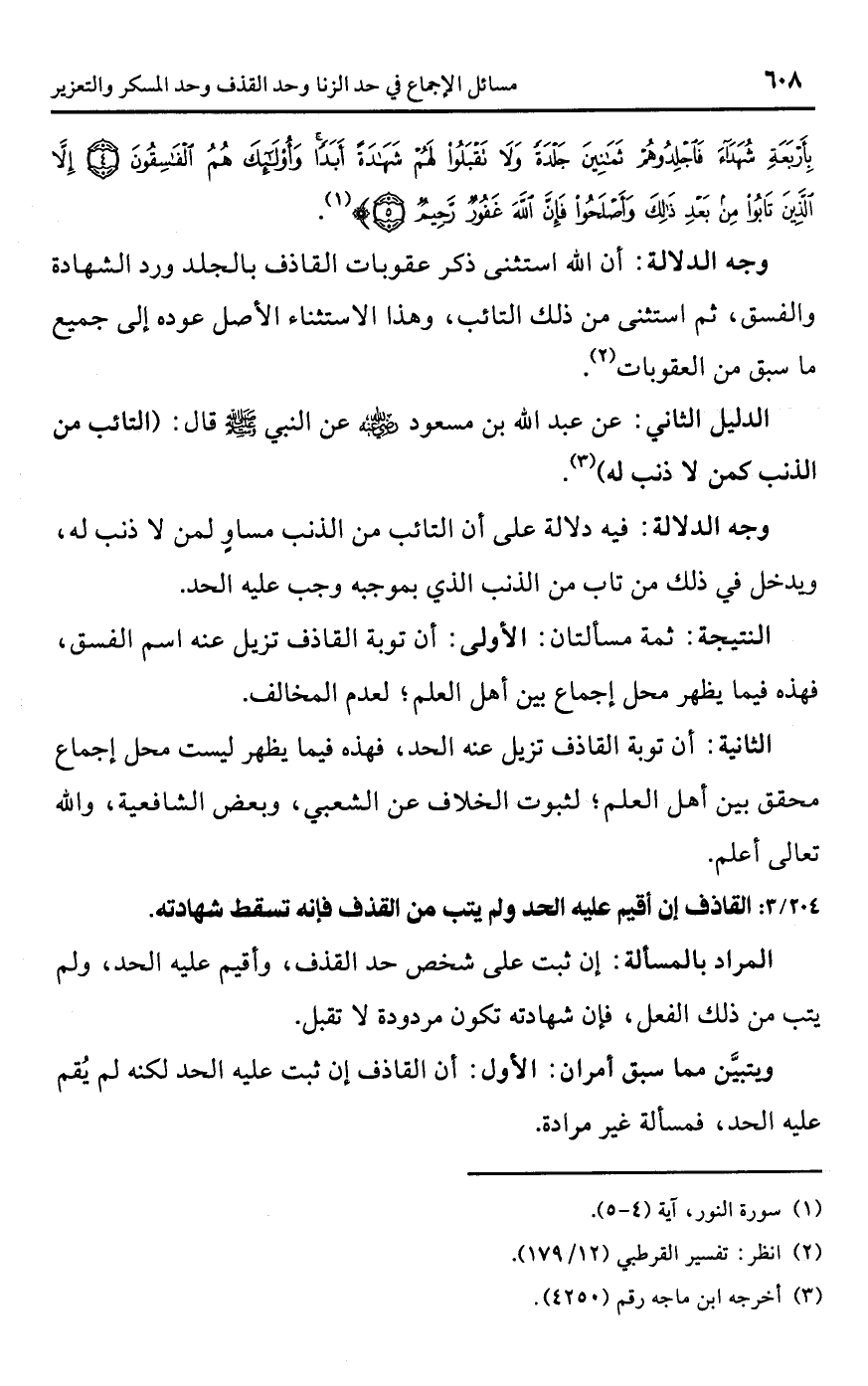 • وجه الدلالة: فيه دلالة على أن التائب من الذنب مساوٍ لمن لا ذنب له، ويدخل في ذلك من تاب من الذنب الذي بموجبه وجب عليه الحد.Rثمة مسألتان: الأولى: أن توبة القاذف تزيل عنه اسم الفسق، فهذه فيما يظهر محل إجماع بين أهل العلم؛ لعدم المخالف.
