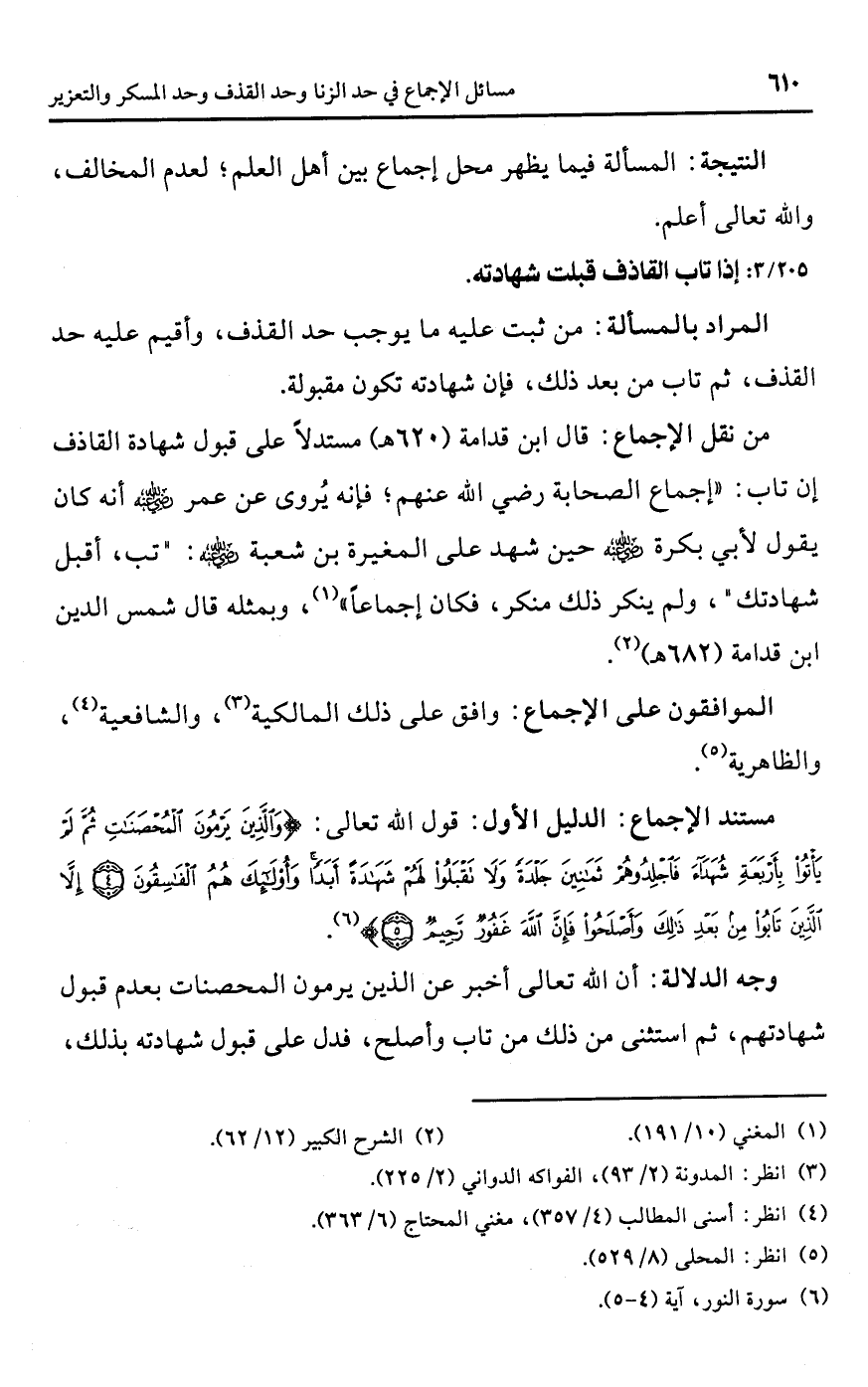 • مستند الإجماع: الدليل الأول: قول اللَّه تعالى: {وَالَّذِينَ يَرْمُونَ الْمُحْصَنَاتِ ثُمَّ لَمْ يَأْتُوا بِأَرْبَعَةِ شُهَدَاءَ فَاجْلِدُوهُمْ ثَمَانِينَ جَلْدَةً وَلَا تَقْبَلُوا لَهُمْ شَهَادَةً أَبَدًا وَأُولَئِكَ هُمُ الْفَاسِقُونَ (4) إِلَّا الَّذِينَ تَابُوا مِنْ بَعْدِ ذَلِكَ وَأَصْلَحُوا فَإِنَّ اللَّهَ غَفُورٌ رَحِيمٌ (5)} (¬6).
