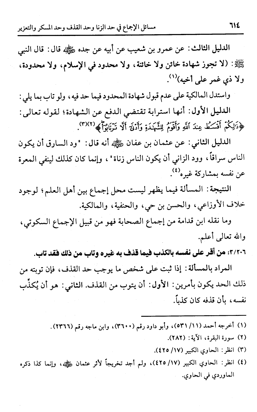 الدليل الثاني: عن عثمان بن عفان -رضي اللَّه عنه- أنه قال: "ود السارق أن يكون الناس سراقًا، وود الزاني أن يكون الناس زناة"، وإنما كان كذلك لينفي المعرفة عن نفسه بمشاركة غيره (¬4).Rالمسألة فيما يظهر ليست محل إجماع بين أهل العلم؛ لوجود خلاف الأوزاعي، والحسن بن حي، والحنفية، والمالكية.