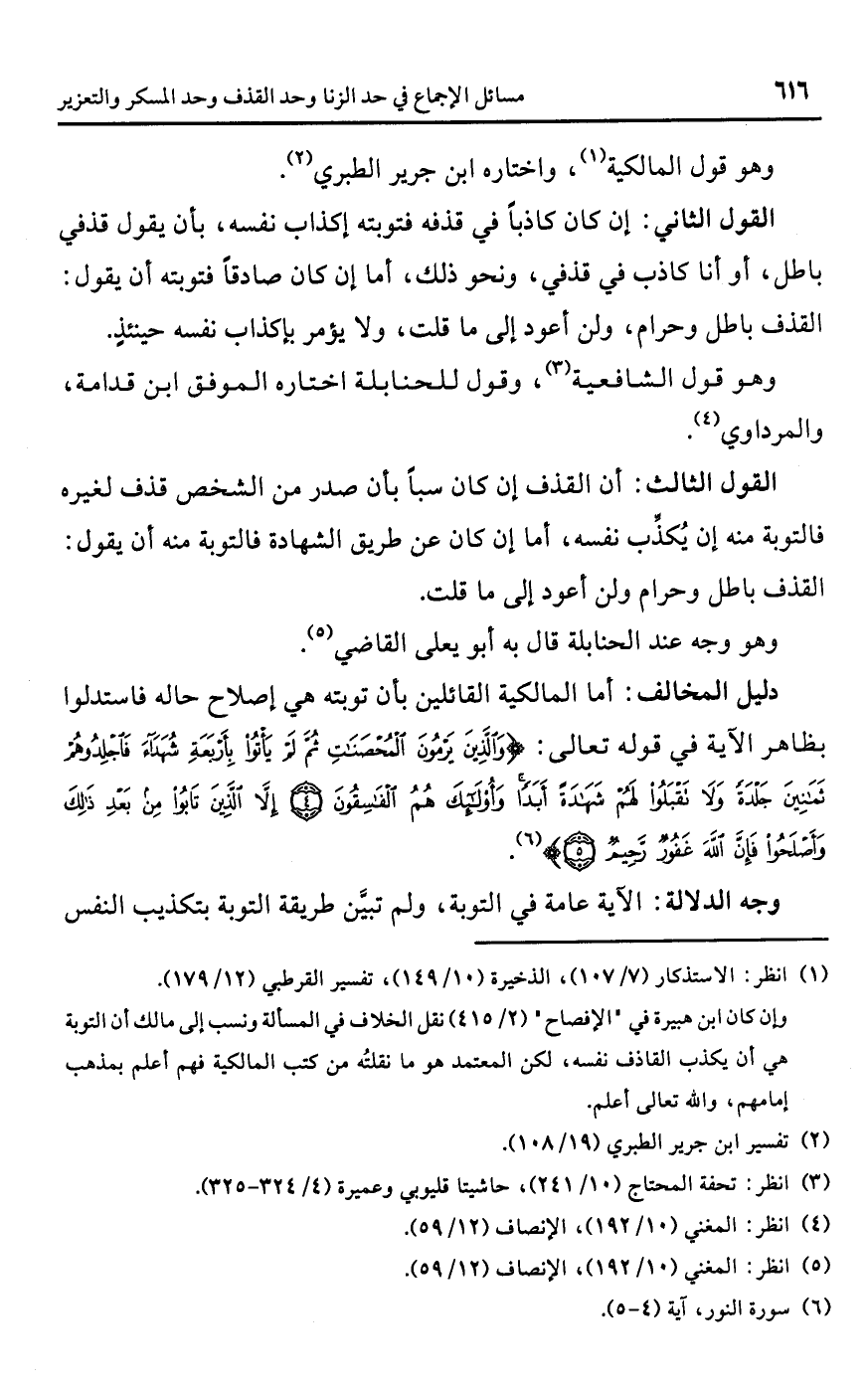 • دليل المخالف: أما المالكية القائلين بأن توبته هي إصلاح حالة فاستدلوا بظاهر الآية في قوله تعالى: {وَالَّذِينَ يَرْمُونَ الْمُحْصَنَاتِ ثُمَّ لَمْ يَأْتُوا بِأَرْبَعَةِ شُهَدَاءَ فَاجْلِدُوهُمْ ثَمَانِينَ جَلْدَةً وَلَا تَقْبَلُوا لَهُمْ شَهَادَةً أَبَدًا وَأُولَئِكَ هُمُ الْفَاسِقُونَ (4) إِلَّا الَّذِينَ تَابُوا مِنْ بَعْدِ ذَلِكَ وَأَصْلَحُوا فَإِنَّ اللَّهَ غَفُورٌ رَحِيمٌ (5)} (¬6).