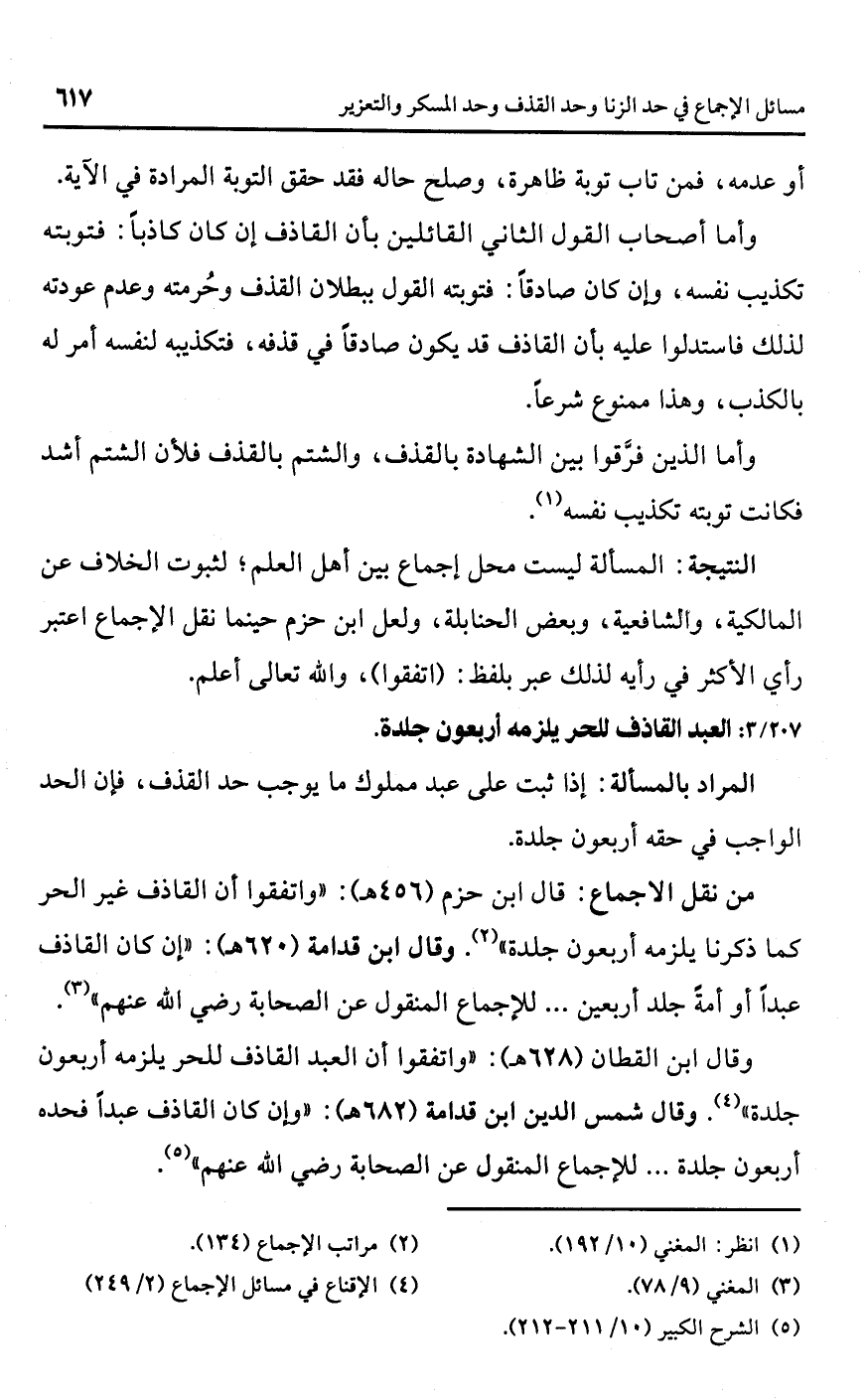 • من نقل الإجماع: قال ابن حزم (456 هـ): "واتفقوا أن القاذف غير الحر كما ذكرنا يلزمه أربعون جلدة" (¬2). وقال ابن قدامة (620 هـ): "إن كان القاذف عبدًا أو أمةً جلد أربعين. . . للإجماع المنقول عن الصحابة رضي اللَّه عنهم" (¬3).