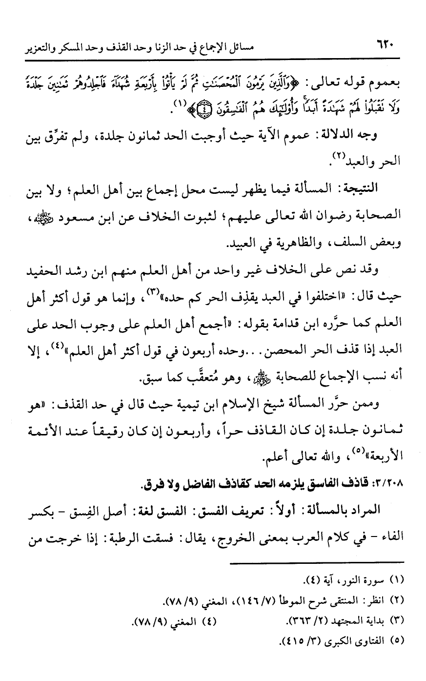 • وجه الدلالة: عموم الآية حيث أوجبت الحد ثمانون جلدة، ولم تفرِّق بين الحر والعبد (¬2).Rالمسألة فيما يظهر ليست محل إجماع بين أهل العلم؛ ولا بين الصحابة رضوان اللَّه تعالى عليهم؛ لثبوت الخلاف عن ابن مسعود -رضي اللَّه عنه-، وبعض السلف، والظاهرية في العبيد.