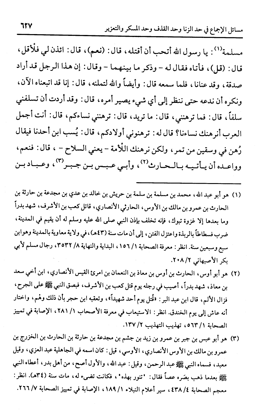 (¬1) هو أبو عبد اللَّه، محمد بن مسلمة بن سلمة بن حريش بن خالد بن عدي بن مجدعة بن حارثة بن الحارث بن عمرو بن مالك بن الأوس، الحارثي الأنصاري، قاتل كعب بن الأشرف، شهد بدرًا وما بعدها إلا غزوة تبوك، فإنه تخلف بإذن النبي صلى اللَّه عليه وسلم له أن يقيم في المدينة، ضرب فسطاطًا بالربذة واعتزل الفتن، إلى أن مات سنة (43 هـ)، في ولاية معاوية بالمدينة وهو ابن سبع وسبعين سنة. انظر: معرفة الصحابة 1/ 156، البداية والنهاية 8/ 3532، رجال مسلم لأبي بكر الأصبهاني 2/ 208.