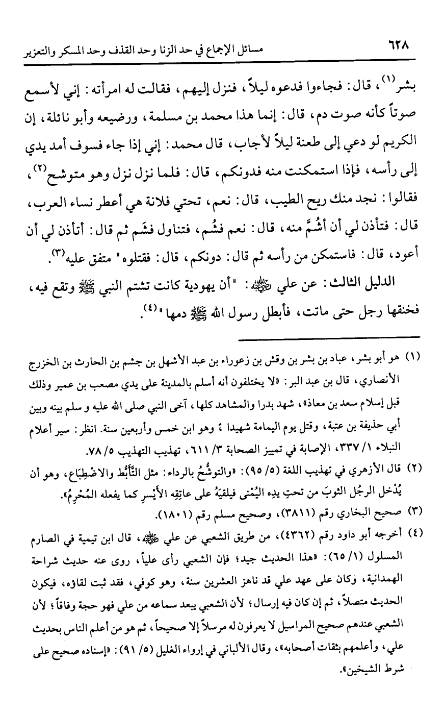(¬4) أخرجه أبو داود رقم (4362)، من طريق الشعبي عن علي -رضي اللَّه عنه-، قال ابن تيمية في الصارم المسلول (1/ 65): "هذا الحديث جيد؛ فإن الشعبي رأى عليًا، روى عنه حديث شراحة الهمدانية، وكان على عهد علي قد ناهز العشرين سنة، وهو كوفي، فقد ثبت لقاؤه، فيكون الحديث متصلًا، ثم إن كان فيه إرسال؛ لأن الشعبي يبعد سماعه من علي فهو حجة وفاقًا؛ لأن الشعبي عندهم صحيح المراسيل لا يعرفون له مرسلًا إلا صحيحًا، ثم هو من أعلم الناس بحديث علي، وأعلمهم بثقات أصحابه"، وقال الألباني في إرواء الغليل (5/ 91): "إسناده صحيح على شرط الشيخين".