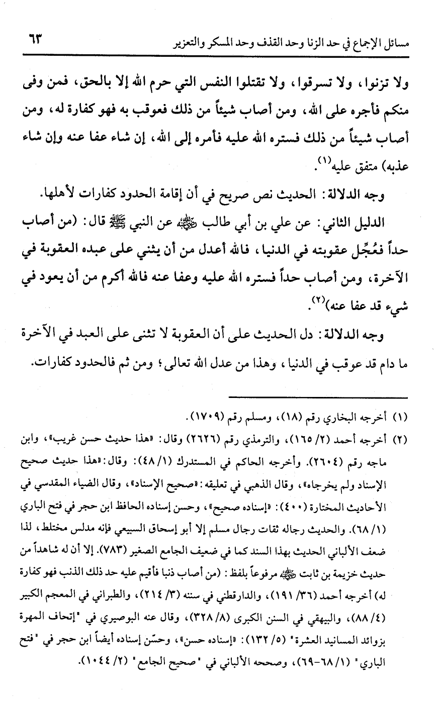 (¬2) أخرجه أحمد (2/ 165)، والترمذي رقم (2626) وقال: "هذا حديث حسن غريب"، وابن ماجه رقم (2604). وأخرجه الحاكم في المستدرك (1/ 48): وقال: "هذا حديث صحيح الإسناد ولم يخرجاه"، وقال الذهبي في تعليقه: "صحيح الإسناد"، وقال الضياء المقدسي في الأحاديث المختارة (400): "إسناده صحيح"، وحسن إسناده الحافظ ابن حجر في فتح الباري (1/ 68). والحديث رجاله ثقات رجال مسلم إلا أبو إسحاق السبيعي فإنه مدلس مختلط، لذا ضعف الألباني الحديث بهذا السند كما في ضعيف الجامع الصغير (783). إلا أن له شاهدًا من حديث خزيمة بن ثابت -رضي اللَّه عنه- مرفوعًا بلفظ: (من أصاب ذنبا فأقيم عليه حد ذلك الذنب فهو كفارة له) أخرجه أحمد (36/ 191)، والدارقطني في سننه (3/ 214)، والطبراني في المعجم الكبير (4/ 88)، والبيهقي في السنن الكبرى (8/ 328)، وقال عنه البوصيري في "إتحاف المهرة بزوائد المسانيد العشرة" (5/ 132): "إسناده حسن"، وحسّن إسناده أيضًا ابن حجر في "فتح الباري" (1/ 68 - 69)، وصححه الألباني في "صحيح الجامع" (2/ 1044).