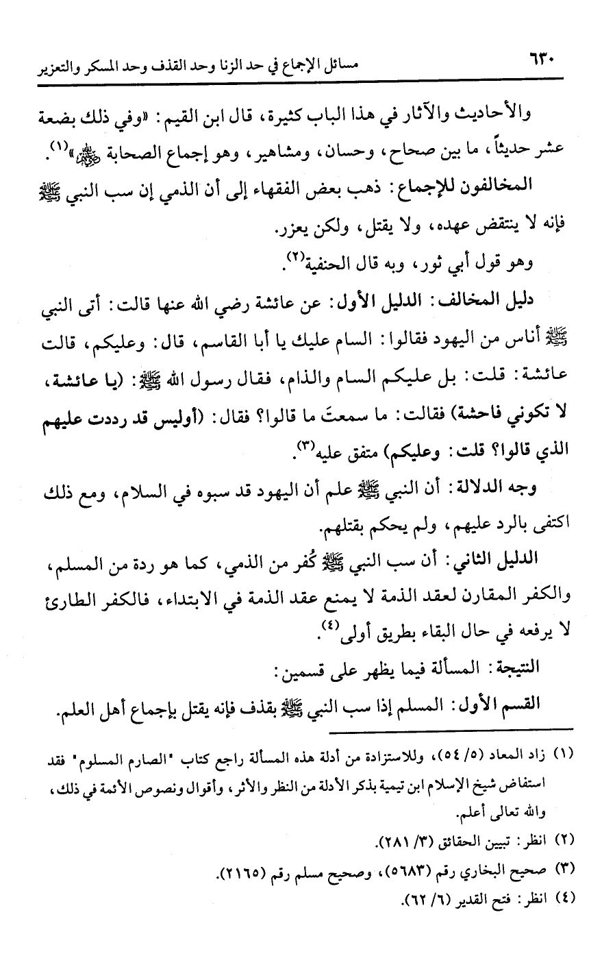 (¬1) زاد المعاد (5/ 54)، وللاستزادة من أدلة هذه المسألة راجع كتاب "الصارم المسلوم" فقد استفاض شيخ الإسلام ابن تيمية بذكر الأدلة من النظر والأثر، وأقوال ونصوص الأئمة في ذلك، واللَّه تعالى أعلم.