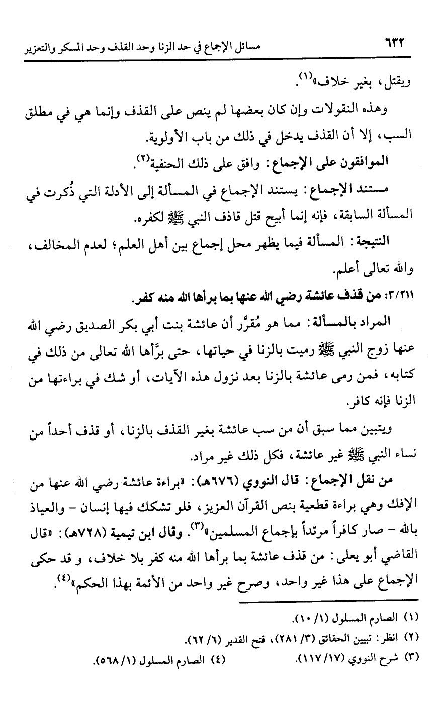 • من نقل الإجماع: قال النووي (676 هـ): "براءة عائشة رضي اللَّه عنها من الإفك وهي براءة قطعية بنص القرآن العزيز، فلو تشكك فيها إنسان -والعياذ باللَّهِ- صار كافرًا مرتدًا بإجماع المسلمين" (¬3). وقال ابن تيمية (728 هـ): "قال القاضي أبو يعلى: من قذف عائشة بما برأها اللَّه منه كفر بلا خلاف، وقد حكى الإجماع على هذا غير واحد، وصرح غير واحد من الأئمة بهذا الحكم" (¬4).