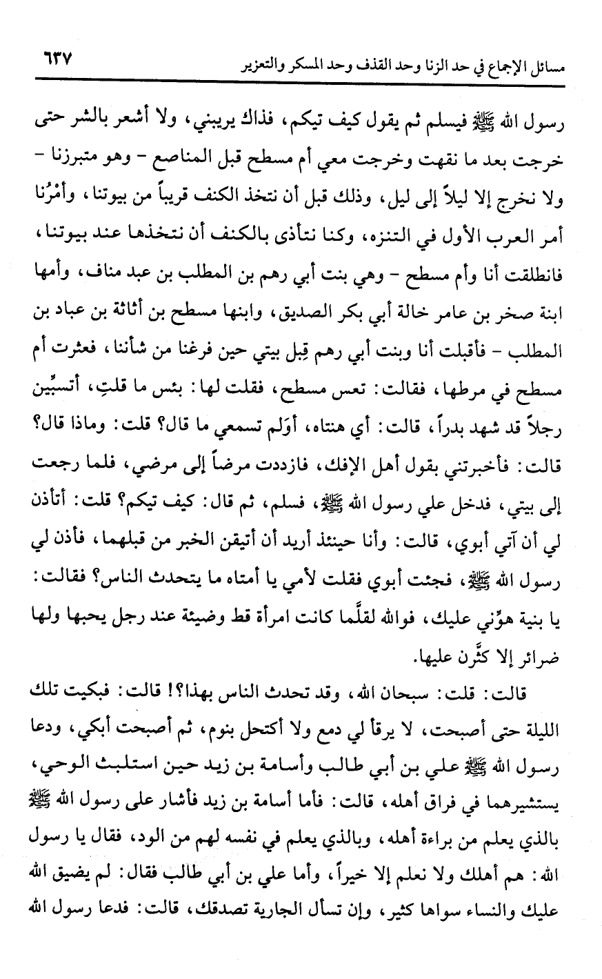 قالت: قلت: سبحان اللَّه، وقد تحدث الناس بهذا؟ ! قالت: فبكيت تلك الليلة حتى أصبحت، لا يرقأ لي دمع ولا أكتحل بنوم، ثم أصبحت أبكي، ودعا رسول اللَّه -صلى اللَّه عليه وسلم- علي بن أبي طالب وأسامة بن زيد حين استلبث الوحي، يستشيرهما في فراق أهله، قالت: فأما أسامة بن زيد فأشار على رسول اللَّه -صلى اللَّه عليه وسلم- بالذي يعلم من براءة أهله، وبالذي يعلم في نفسه لهم من الود، فقال يا رسول اللَّه: هم أهلك ولا نعلم إلا خيرًا، وأما علي بن أبي طالب فقال: لم يضيق اللَّه عليك والنساء سواها كثير، وإن تسأل الجارية تصدقك، قالت: فدعا رسول اللَّه