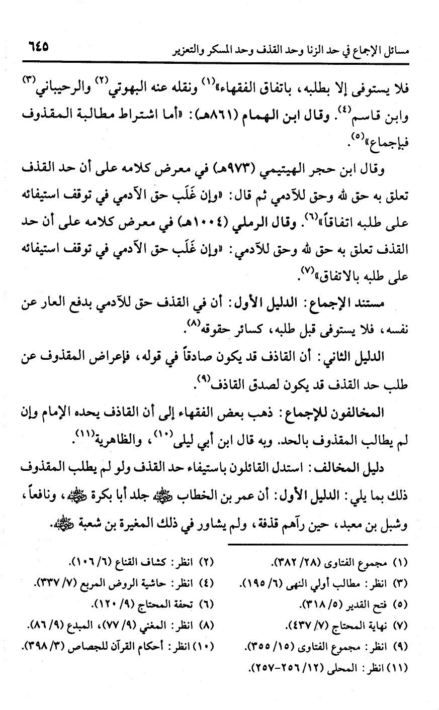 وقال ابن حجر الهيتيمي (973 هـ) في معرض كلامه على أن حد القذف تعلق به حق للَّه وحق للآدمي ثم قال: "وإن غَلَب حق الأدمي في توقف استيفائه على طلبه اتفاقًا" (¬6). وقال الرملي (1004 هـ) في معرض كلامه على أن حد القذف تعلق به حق للَّه وحق للآدمي: "وإن غَلَب حق الآدمي في توقف استيفائه على طلبه بالاتفاق" (¬7).