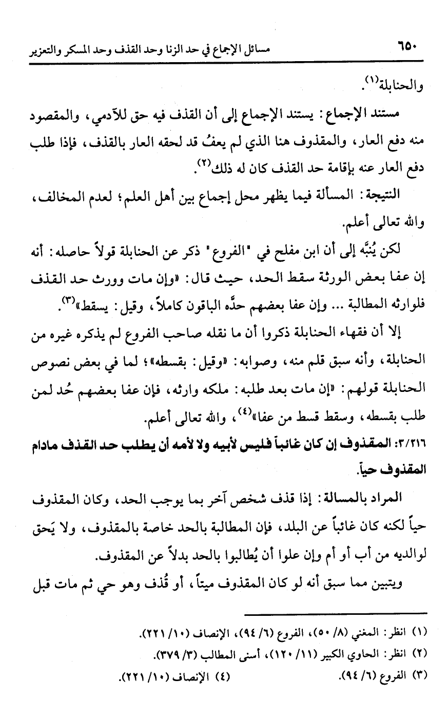 [216/ 3] المقذوف أن كان غائبًا فليس لأبيه ولا لأمه أن يطلب حد القذف ما دام المقذوف حيًّا.
