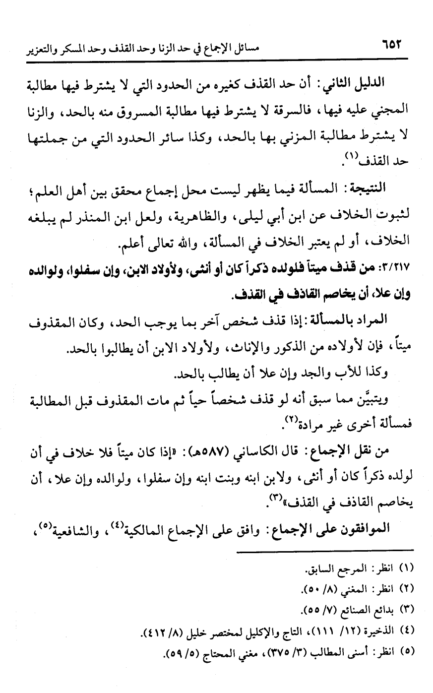 • من نقل الإجماع: قال الكاساني (587 هـ): "إذا كان ميتًا فلا خلاف في أن لولده ذكرًا كان أو أنثى، ولابن ابنه وبنت ابنه وإن سفلوا, ولوالده وإن علا، أن يخاصم القاذف في القذف" (¬3).