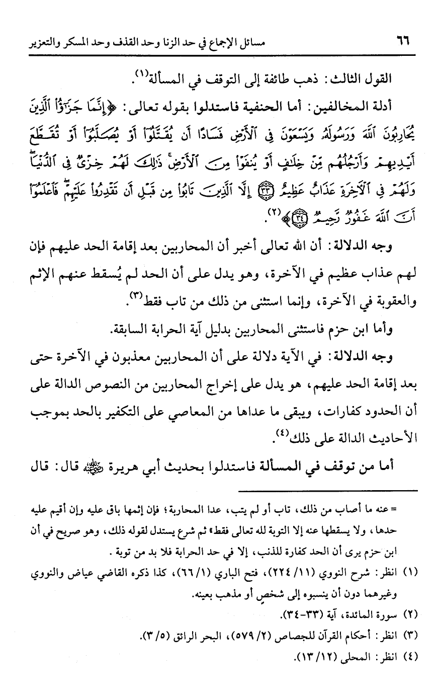 • أدلة المخالفين: أما الحنفية فاستدلوا بقوله تعالى: {إِنَّمَا جَزَاءُ الَّذِينَ يُحَارِبُونَ اللَّهَ وَرَسُولَهُ وَيَسْعَوْنَ فِي الْأَرْضِ فَسَادًا أَنْ يُقَتَّلُوا أَوْ يُصَلَّبُوا أَوْ تُقَطَّعَ أَيْدِيهِمْ وَأَرْجُلُهُمْ مِنْ خِلَافٍ أَوْ يُنْفَوْا مِنَ الْأَرْضِ ذَلِكَ لَهُمْ خِزْيٌ فِي الدُّنْيَا وَلَهُمْ فِي الْآخِرَةِ عَذَابٌ عَظِيمٌ (33) إِلَّا الَّذِينَ تَابُوا مِنْ قَبْلِ أَنْ تَقْدِرُوا عَلَيْهِمْ فَاعْلَمُوا أَنَّ اللَّهَ غَفُورٌ رَحِيمٌ (34)} (¬2).