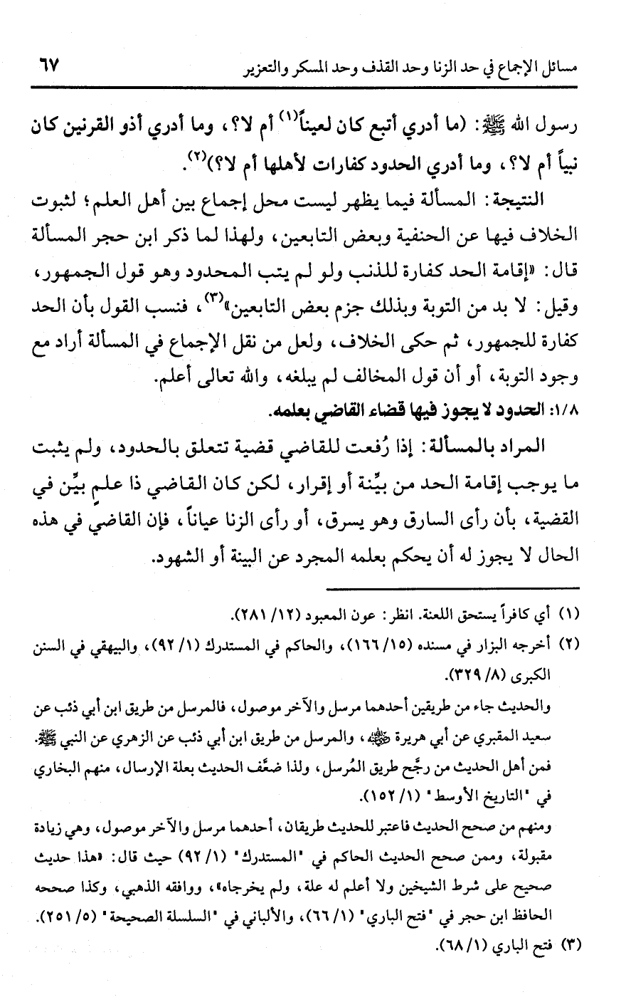 رسول اللَّه -صلى اللَّه عليه وسلم-: (ما أدري أتبع كان لعينًا (¬1) أم لا؟ ، وما أدري أذو القرنين كان نبيًا أم لا؟ ، وما أدري الحدود كفارات لأهلها أم لا؟ ) (¬2).Rالمسألة فيما يظهر ليست محل إجماع بين أهل العلم؛ لثبوت الخلاف فيها عن الحنفية وبعض التابعين، ولهذا لما ذكر ابن حجر المسألة قال: "إقامة الحد كفارة للذنب ولو لم يتب المحدود وهو قول الجمهور، وقيل: لا بد من التوبة وبذلك جزم بعض التابعين" (¬3)، فنسب القول بأن الحد كفارة للجمهور، ثم حكى الخلاف، ولعل من نقل الإجماع في المسألة أراد مع وجود التوبة، أو أن قول المخالف لم يبلغه، واللَّه تعالى أعلم.