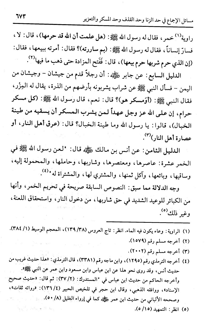 وجه الدلالة مما سبق: النصوص السابقة صريحة في تحريم الخمر، وأنها من الكبائر للوعيد الشديد في حق شاربها، من دخول النار، واستحقاق اللعنة، وغير ذلك (¬5).