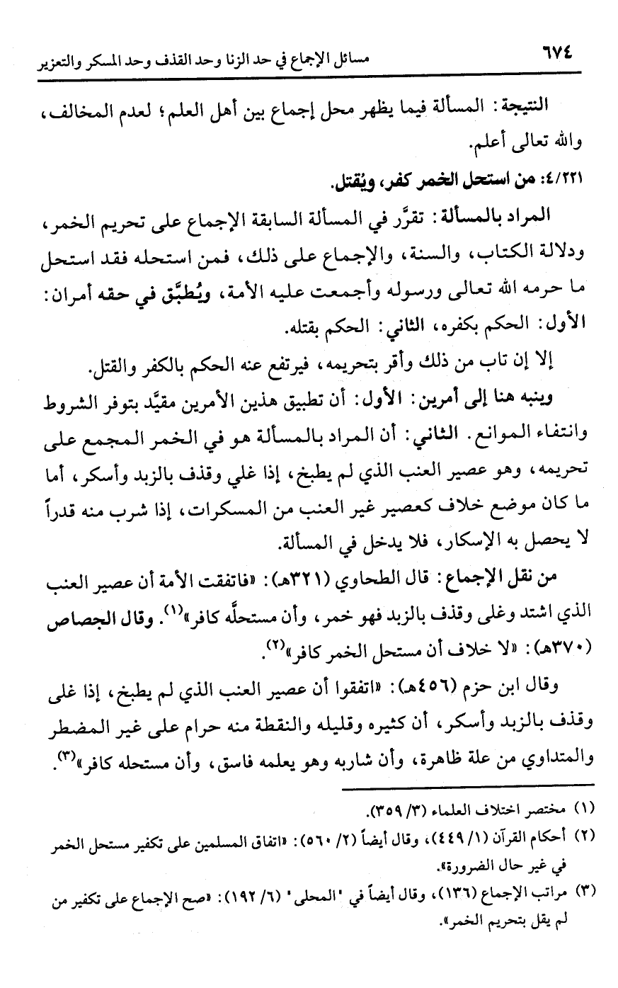 (¬2) أحكام القرآن (1/ 449)، وقال أيضًا (2/ 560): "اتفاق المسلمين على تكفير مستحل الخمر في غير حال الضرورة".