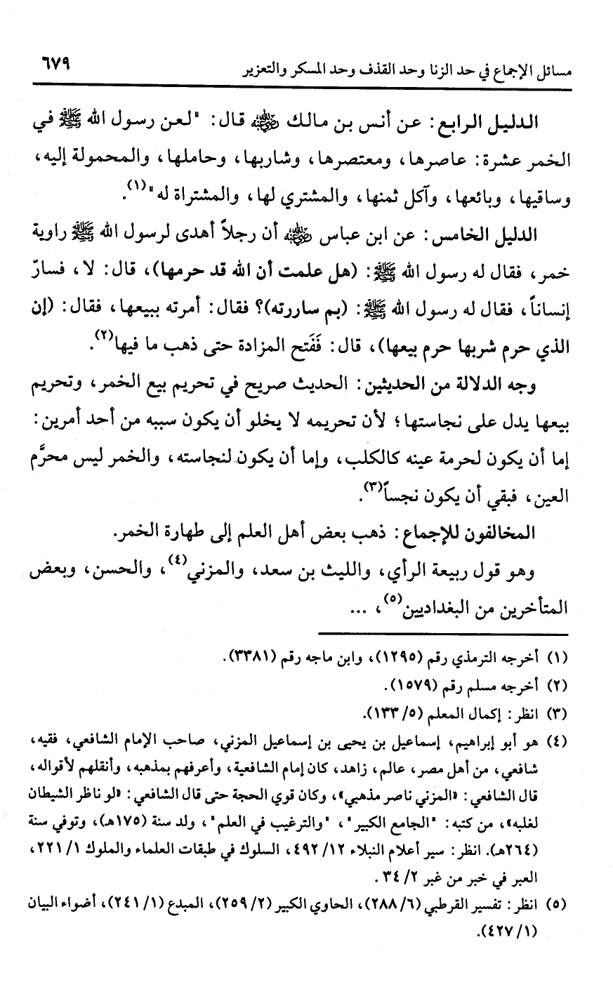(¬4) هو أبو إبراهيم، إسماعيل بن يحيى بن إسماعيل المزني، صاحب الأمام الشافعي، فقيه، شافعي، من أهل مصر، عالم، زاهد، كان إمام الشافعية، وأعرفهم بمذهبه، وأنقلهم لأقواله، قال الشافعي: "المزني ناصر مذهبي"، وكان قوي الحجة حتى قال الشافعي: "لو ناظر الشيطان لغلبه"، من كتبه: "الجامع الكبير"، و"الترغيب في العلم"، ولد سنة (175 هـ)، وتوفي سنة (264 هـ). انظر: سير أعلام النبلاء 12/ 492، السلوك في طبقات العلماء والملوك 1/ 221، العبر في خبر من غبر 2/ 34.