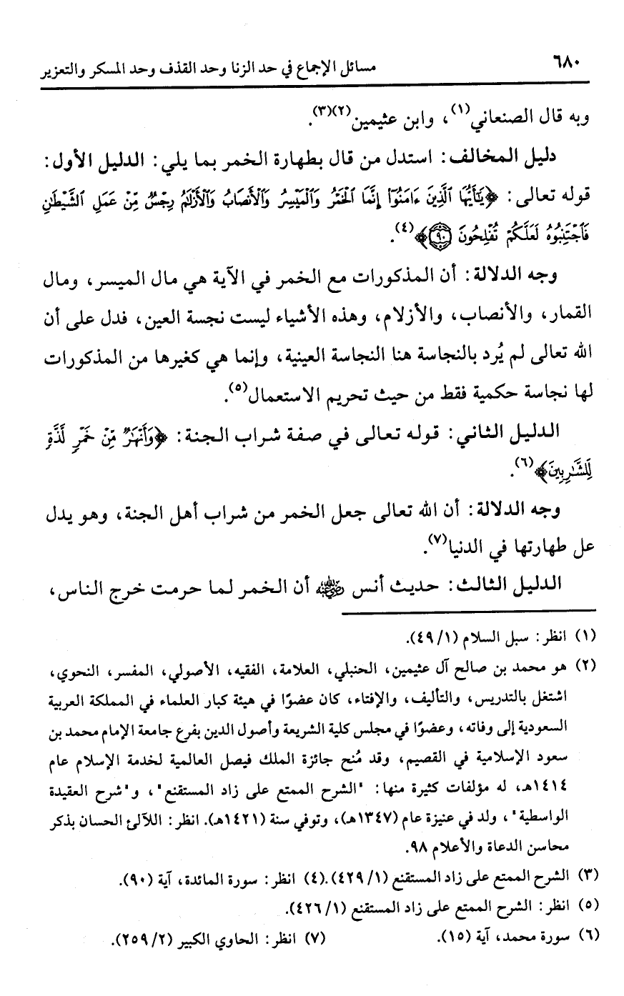 (¬2) هو محمد بن صالح آل عثيمين، الحنبلي، العلامة، الفقيه، الأصولي، المفسر، النحوي، اشتغل بالتدريس، والتأليف، والإفتاء، كان عضوًا في هيئة كبار العلماء في المملكة العربية السعودية إلى وفاته، وعضوًا في مجلس كلية الشريعة وأصول الدين بفرع جامعة الأمام محمد بن سعود الإسلامية في القصيم، وقد مُنح جائزة الملك فيصل العالمية لخدمة الإسلام عام 1414 هـ، له مؤلفات كثيرة منها: "الشرح الممتع على زاد المستقنع"، و"شرح العقيدة الواسطية"، ولد في عنيزة عام (1347 هـ)، وتوفي سنة (1421 هـ). انظر: اللآليء الحسان بذكر محاسن الدعاة والأعلام 98.