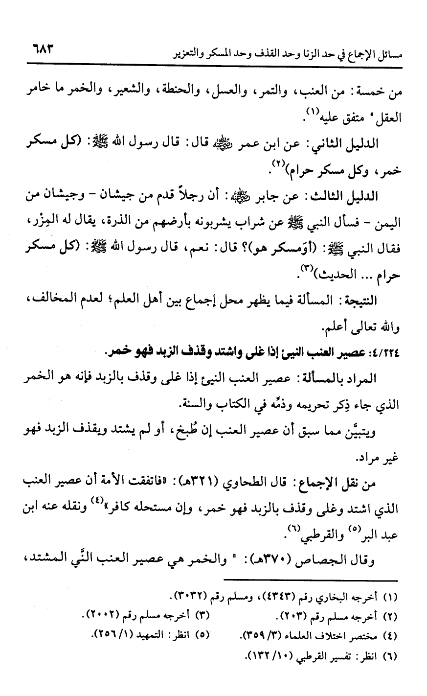 • من نقل الإجماع: قال الطحاوي (321 هـ): "فاتفقت الأمة أن عصير العنب الذي اشتد وغلى وقذف بالزبد فهو خمر، وإن مستحله كافر" (¬4) ونقله عنه ابن عبد البر (¬5) والقرطبي (¬6).