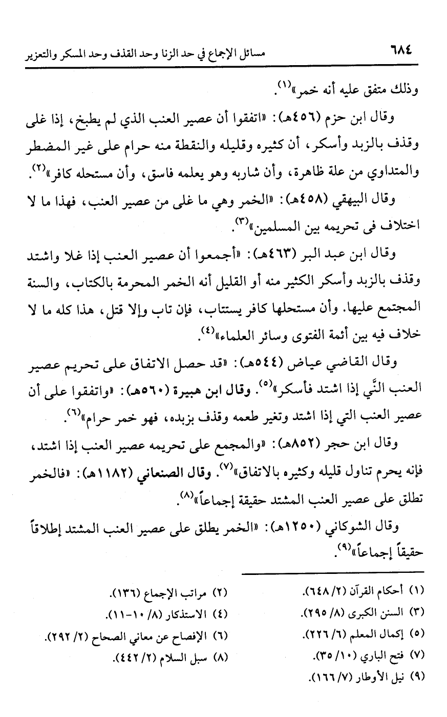 وقال ابن حزم (456 هـ): "اتفقوا أن عصير العنب الذي لم يطبخ، إذا غلى وقذف بالزبد وأسكر، أن كثيره وقليله والنقطة منه حرام على غير المضطر والمتداوي من علة ظاهرة، وأن شاربه وهو يعلمه فاسق، وأن مستحله كافر" (¬2).