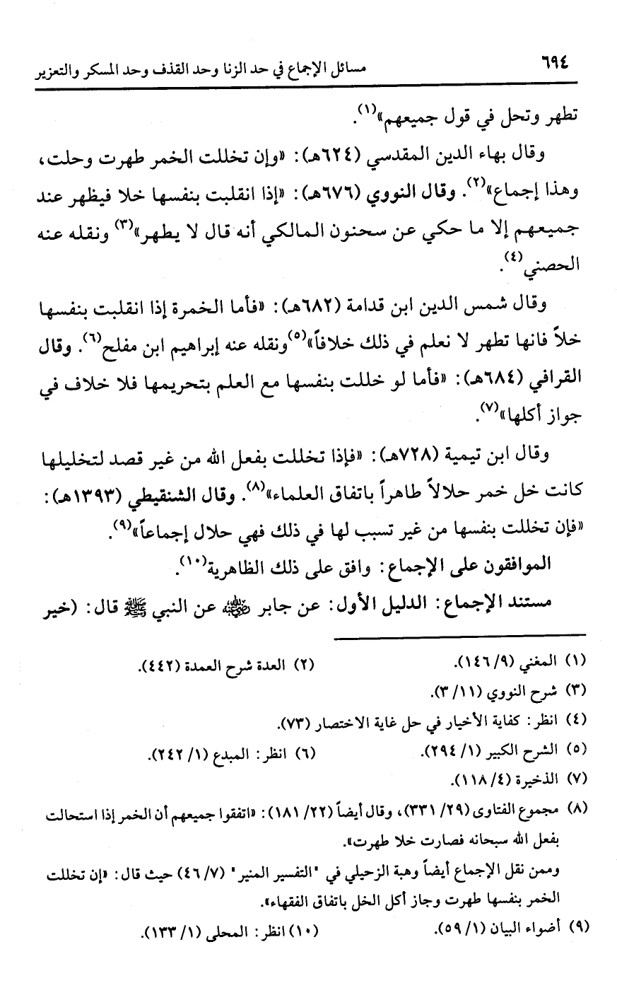 وقال بهاء الدين المقدسي (624 هـ): "وإن تخللت الخمر طهرت وحلت، وهذا إجماع" (¬2). وقال النووي (676 هـ): "إذا انقلبت بنفسها خلا فيظهر عند جميعهم إلا ما حكي عن سحنون المالكي أنه قال لا يطهر" (¬3) ونقله عنه الحصني (¬4).