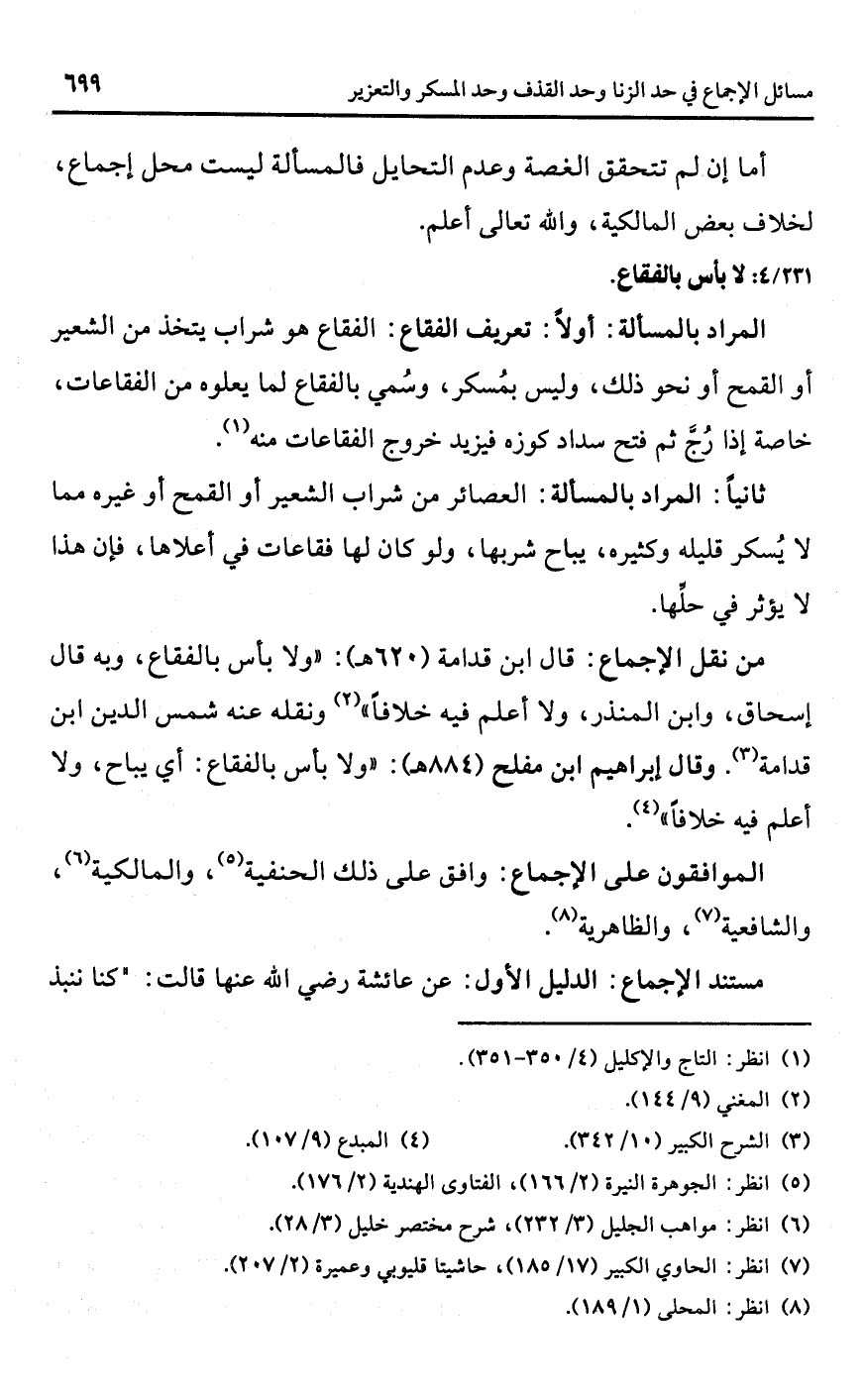 • من نقل الإجماع: قال ابن قدامة (620 هـ): "ولا بأس بالفقاع، وبه قال إسحاق، وابن المنذر، ولا أعلم فيه خلافا" (¬2) ونقله عنه شمس الدين ابن قدامة (¬3). وقال إبراهيم ابن مفلح (884 هـ): "ولا بأس بالفقاع: أي يباح، ولا أعلم ليه خلافًا" (¬4).