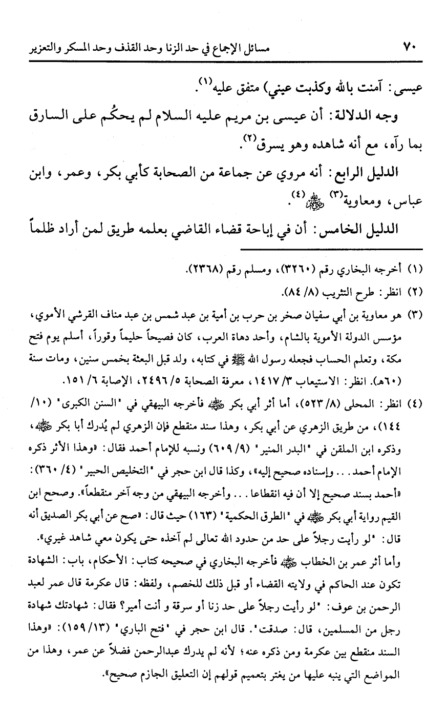 (¬4) انظر: المحلى (8/ 523)، أما أثر أبي بكر -رضي اللَّه عنه- فأخرجه البيهقي في "السنن الكبرى" (10/ 144)، من طريق الزهري عن أبي بكر، وهذا سند منقطع فإن الزهري لم يُدرك أبا بكر -رضي اللَّه عنه-، وذكره ابن الملقن في "البدر المنير" (9/ 609) ونسبه للإمام أحمد فقال: "وهذا الأثر ذكره الإمام أحمد. . . وإسناده صحيح إليه"، وكذا قال ابن حجر في "التخليص الحبير" (4/ 360): "أحمد بسند صحيح إلا أن فيه انقطاعا. . . وأخرجه البيهقي من وجه آخر منقطعًا". وصحح ابن القيم رواية أبي بكر -رضي اللَّه عنه- في "الطرق الحكمية" (163) حيث قال: "صح عن أبي بكر الصديق أنه قال: لو رأيت رجلًا على حد من حدود اللَّه تعالى لم آخذه حتى يكون معي شاهد غيري، . وأما أثر عمر بن الخطاب -رضي اللَّه عنه- فأخرجه البخاري في صحيحه كتاب: الأحكام، باب: الشهادة تكون عند الحاكم في ولايته القضاء أو قبل ذلك للخصم، ولفظه: قال عكرمة قال عمر لعبد الرحمن بن عوف: " لو رأيت رجلًا على حد زنا أو سرقة وأنت أمير؟ فقال: شهادتك شهادة رجل من المسلمين، قال: صدقت. . قال ابن حجر في "فتح الباري" (13/ 159): "وهذا السند منقطع بين عكرمة ومن ذكره عنه؛ لأنه لم يدرك عبد الرحمن فضلًا عن عمر، وهذا من المواضع التي ينبه عليها من يغتر بتعميم قولهم إن التعليق الجازم صحيح".