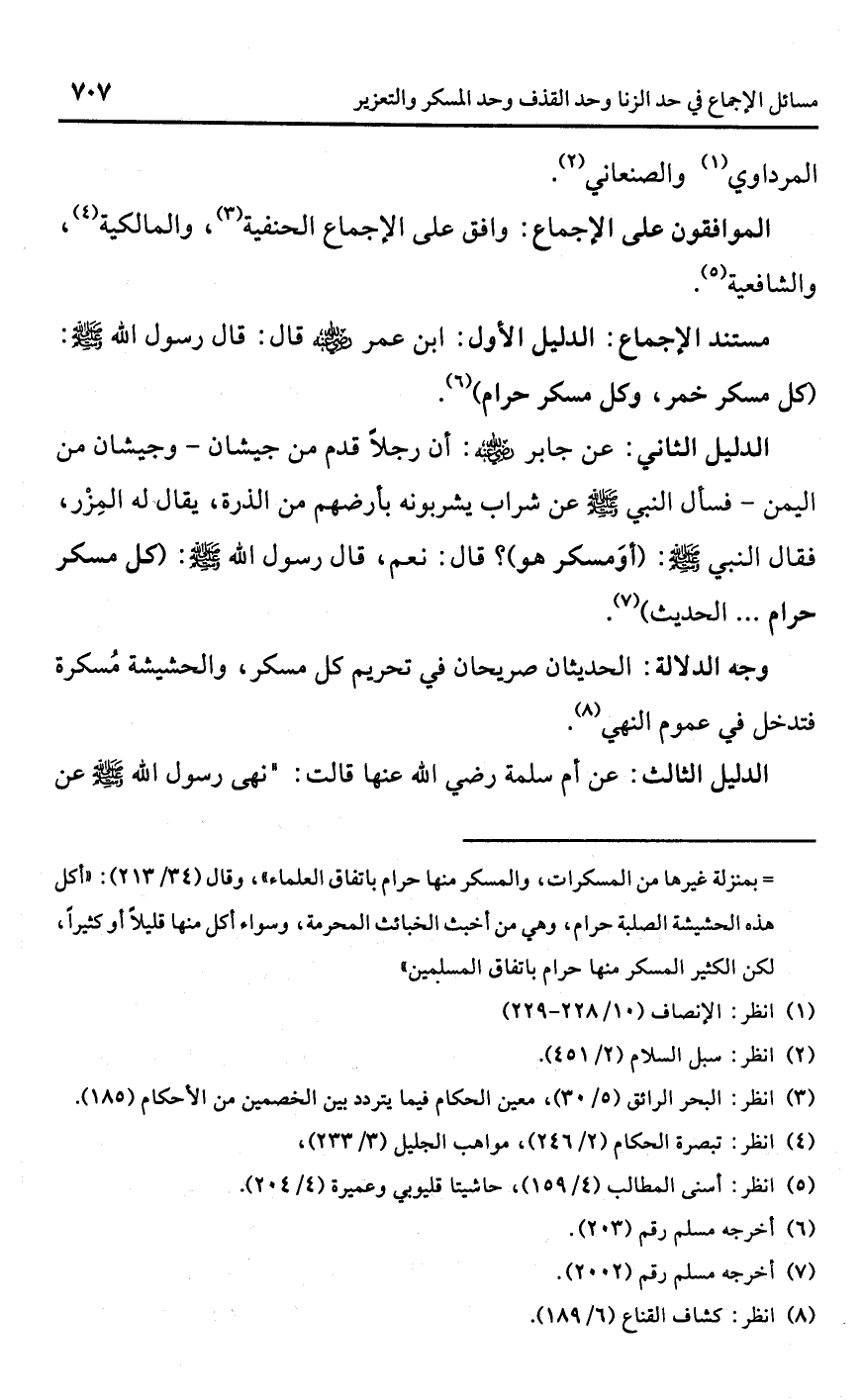 • مستند الإجماع: الدليل الأول: ابن عمر -رضي اللَّه عنه- قال: قال رسول اللَّه -صلى اللَّه عليه وسلم-: (كل مسكر خمر، وكل مسكر حرام) (¬6).