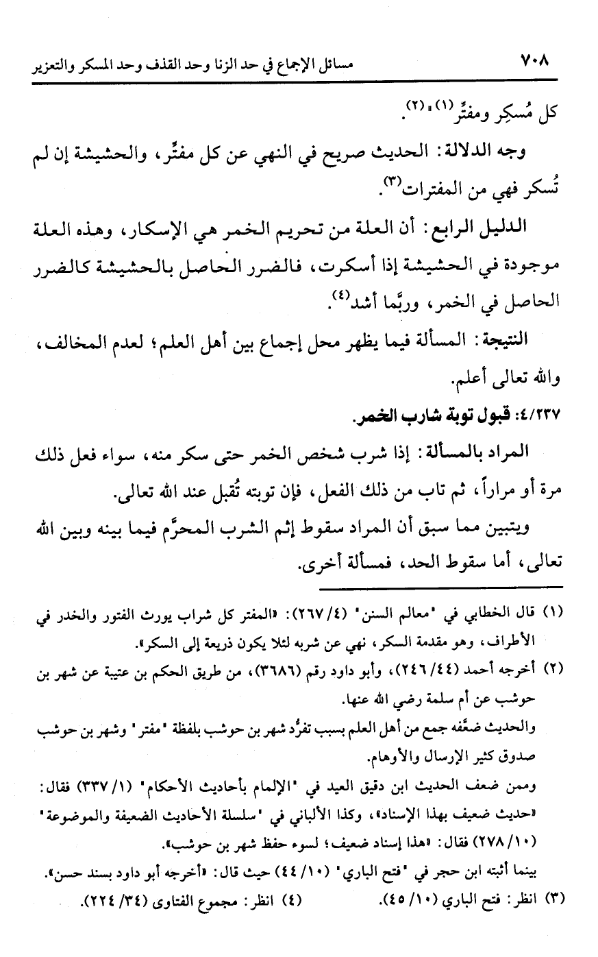 الدليل الرابع: أن العلة من تحريم الخمر هي الإسكار، وهذه العلة موجودة في الحشيشة إذا أسكرت، فالضرر الحاصل بالحشيشة كالضرر الحاصل في الخمر، وربَّما أشد (¬4).Rالمسألة فيما يظهر محل إجماع بين أهل العلم؛ لعدم المخالف، واللَّه تعالى أعلم.