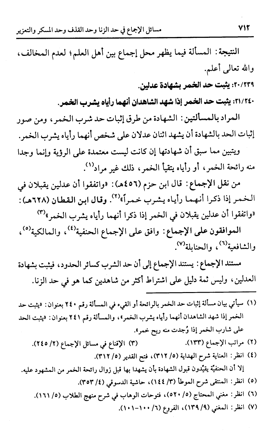 • من نقل الإجماع: قال ابن حزم (456 هـ): "واتفقوا أن عدلين يقبلان في الخمر إذا ذكرا أنهما رأياه يشرب خمرًا" (¬2). وقال ابن القطان (628 هـ): "واتفقوا أن عدلين يقبلان في الخمر إذا ذكرا أنهما رأياه يشرب الخمر" (¬3)