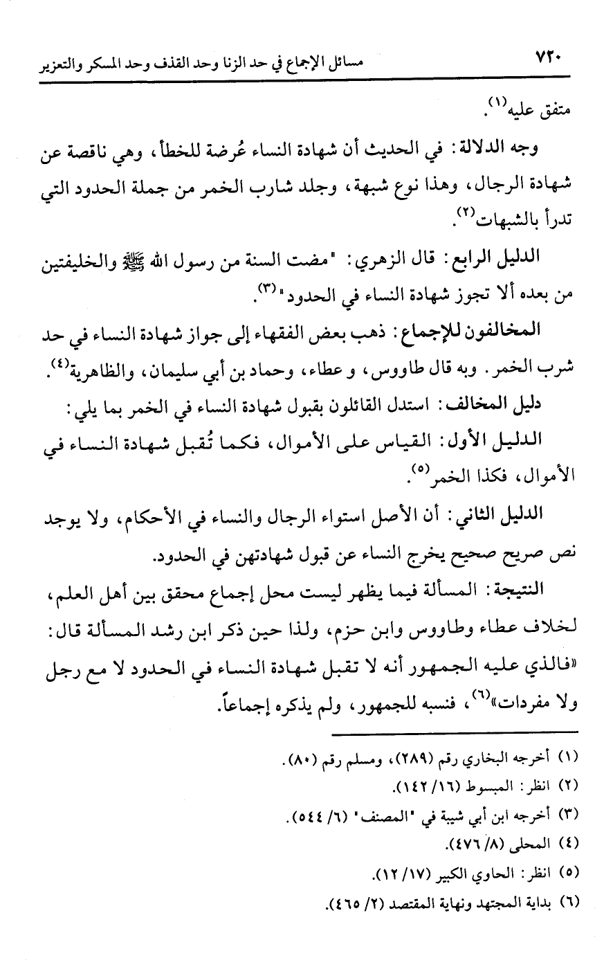 الدليل الثاني: أن الأصل استواء الرجال والنساء في الأحكام، ولا يوجد نص صريح صحيح يخرج النساء عن قبول شهادتهن في الحدود.Rالمسألة فيما يظهر ليست محل إجماع محقق بين أهل العلم، لخلاف عطاء وطاووس وابن حزم، ولذا حين ذكر ابن رشد المسألة قال: "فالذي عليه الجمهور أنه لا تقبل شهادة النساء في الحدود لا مع رجل ولا مفردات" (¬6)، فنسبه للجمهور، ولم يذكره إجماعًا.