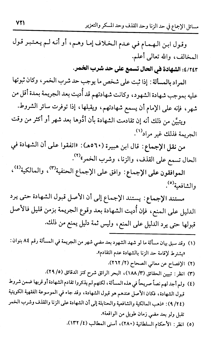 • من نقل الإجماع: قال ابن هبيرة (560 هـ): "اتفقوا على أن الشهادة في الحال تسمع على القذف، والزنا، وشرب الخمر" (¬2).