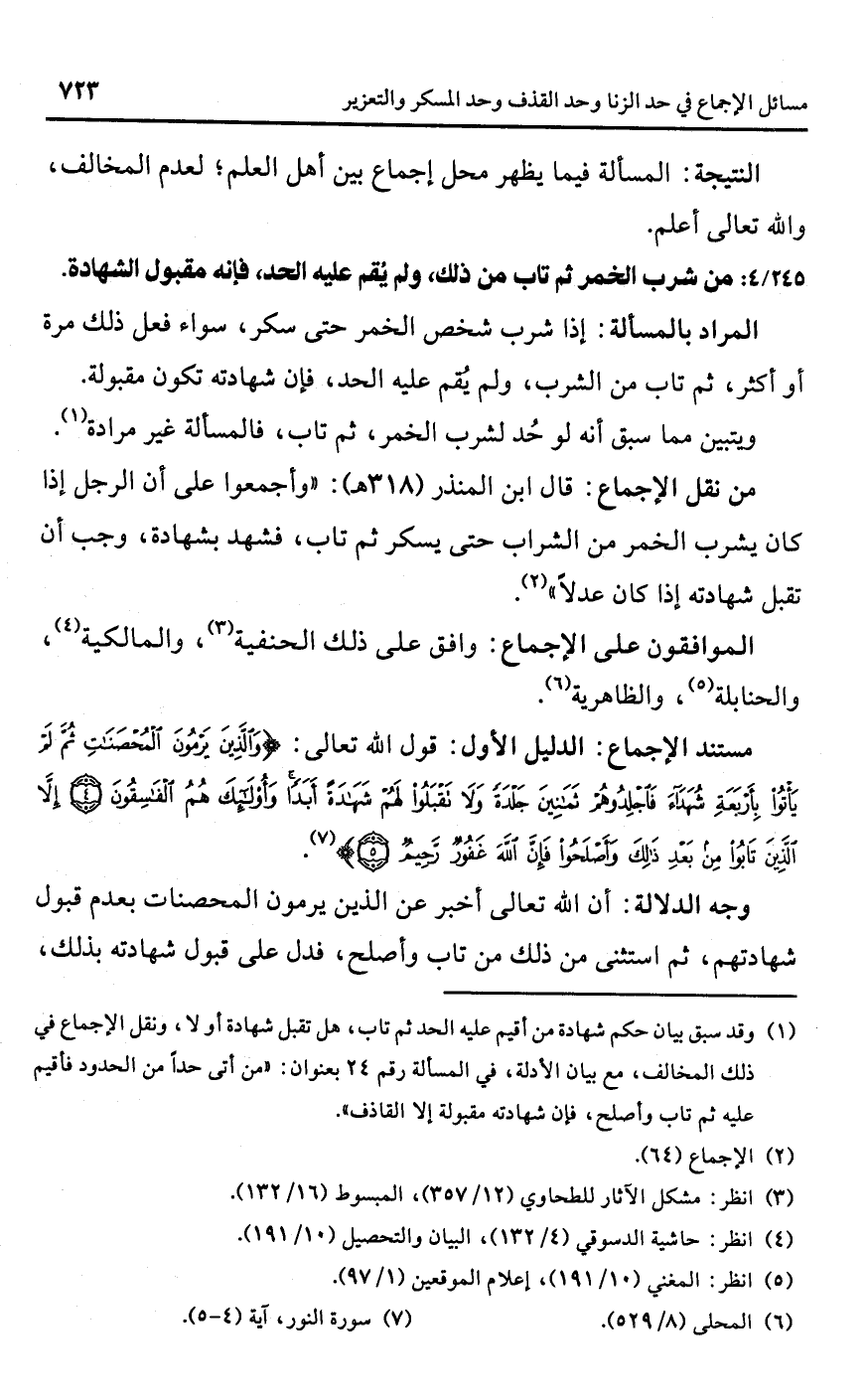 (¬1) وقد سبق بيان حكم شهادة من أقيم عليه الحد ثم تاب، هل تقبل شهادة أو لا، ونقل الإجماع في ذلك المخالف، مع بيان الأدلة، في المسألة رقم 24 بعنوان: "من أتى حدًا من الحدود فأقيم عليه ثم تاب وأصلح، فإن شهادته مقبولة إلا القاذف".