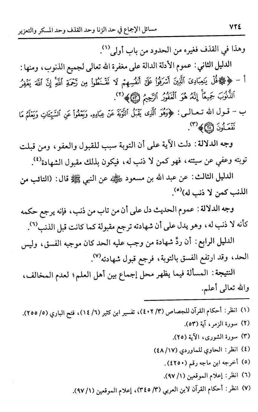 الدليل الرابع: أن ردَّ شهادة من وجب عليه الحد كان موجبه الفسق، وليس الحد، وقد ارتفع الفسق بالتوبة، فرجع قبول شهادته (¬7).Rالمسألة فيما يظهر محل إجماع بين أهل العلم؛ لعدم المخالف، واللَّه تعالى أعلم.