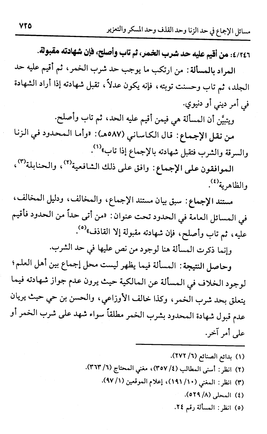 [246/ 4] من أقيم عليه حد شرب الخمر، ثم تاب وأصلح، فإن شهادته مقبوله.