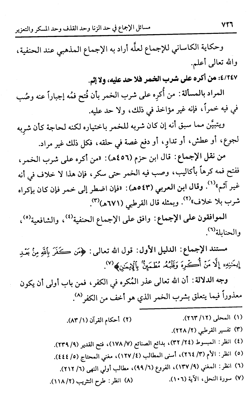 • من نقل الإجماع: قال ابن حزم (456 هـ): "من أكره على شرب الخمر، ففتح فمه كرهًا بأكاليب، وصب فيه الخمر حتى سكر، فإن هذا لا خلاف في أنه غير آثم" (¬1). وقال ابن العربي (543 هـ): "فإن اضطر إلى خمر فإن كان بإكراه شرب بلا خلاف" (¬2). وبمثله قال القرطبي (671 هـ) (¬3).